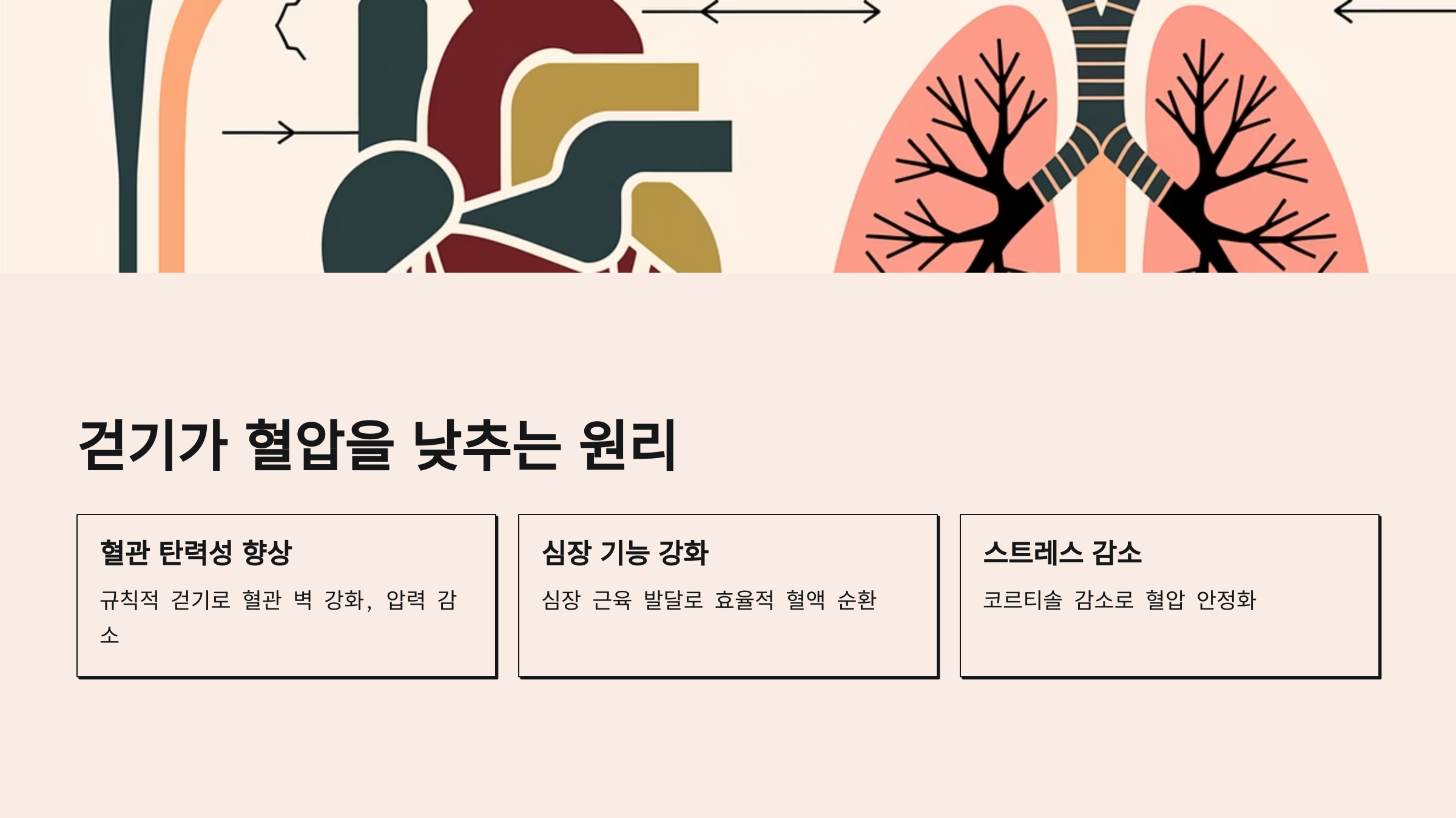 요약하자면, 걷기는 심장을 튼튼하게 하고 혈관을 부드럽게 만드는 자연스러운 혈압 조절 방법으로, 고혈압 환자에게 있어 가장 쉽고 효과적인 운동 습관이라 할 수 있습니다.