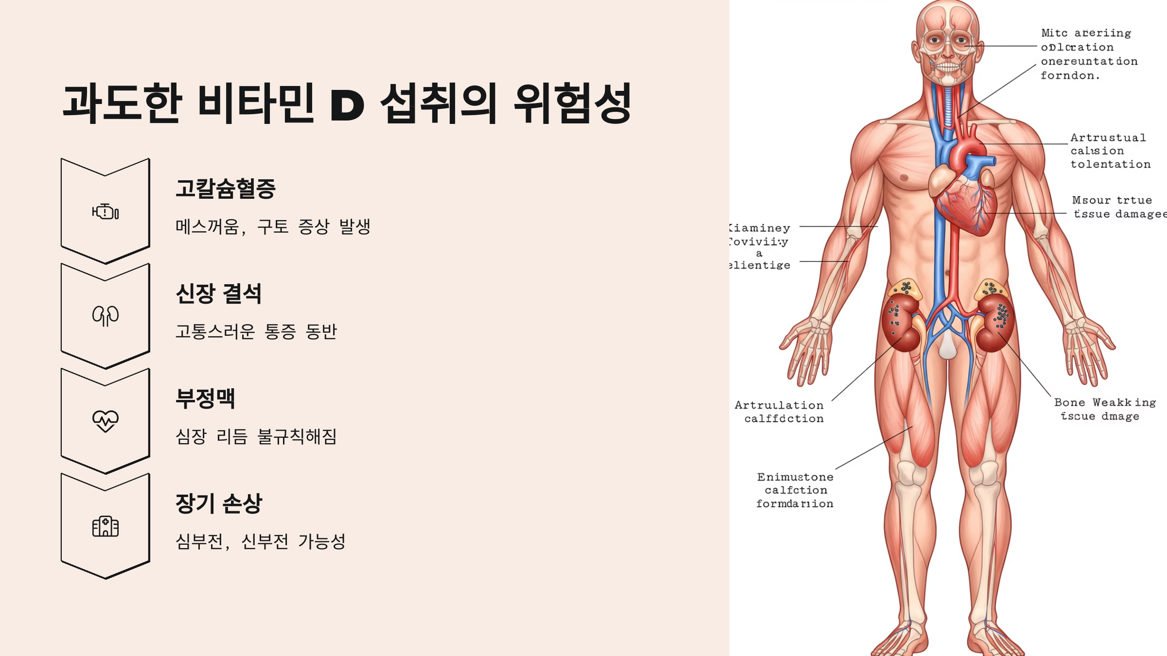 비타민D는 지용성 비타민이라 체내에 축적되기 쉬운 특성이 있기 때문에 과도하게 섭취할 경우 독성을 유발할 수 있는데, 특히 하루 100㎍(4,000IU)을 넘는 고용량을 장기간 복용하면 혈중 칼슘 농도가 비정상적으로 높아지는 고칼슘혈증이 생길 수 있으며, 이로 인해 메스꺼움, 구토, 식욕부진, 변비, 심한 경우 신장 결석이나 신장 기능 저하로 이어질 수 있어 아무리 건강에 좋다고 알려진 비타민D라도 무분별한 복용은 피해야 하고, 반드시 정해진 권장량을 지키거나 의료 전문가와 상의한 후 자신의 상태에 맞게 조절하는 것이 중요하다.