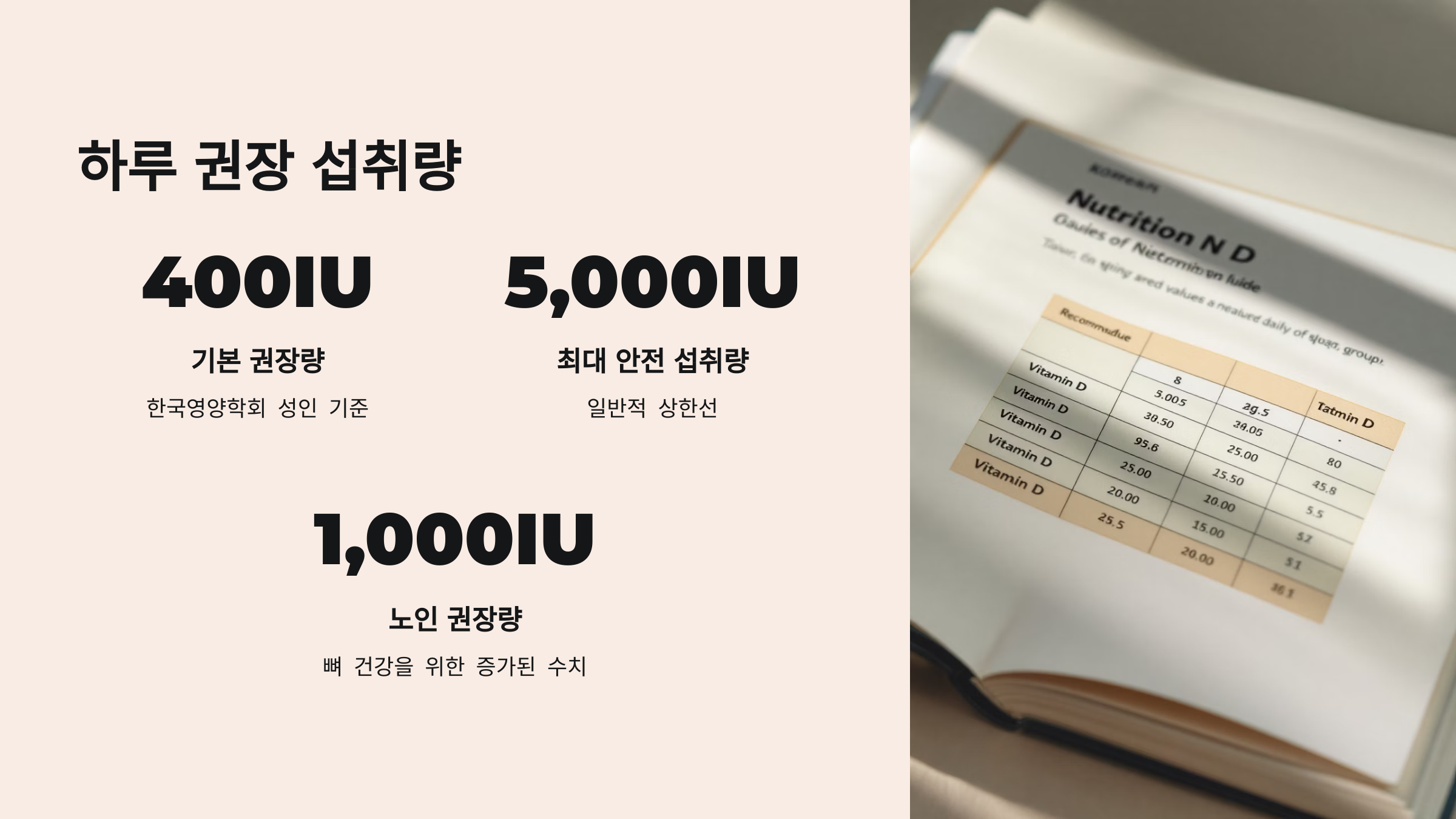 대한민국 식약처에서는 성인의 경우 하루 10㎍(마이크로그램), 즉 400IU(국제단위)를 비타민D의 권장 섭취량으로 제시하고 있습니다. 하지만 개인의 연령, 성별, 건강 상태, 햇빛 노출량에 따라 필요량이 달라질 수 있습니다. 예를 들어, 임산부나 수유부, 노인층, 실내에서 생활하는 시간이 많은 직장인 등은 더 많은 섭취가 권장되기도 합니다. 미국의 경우 600~800IU까지 권장되며, 전문가들은 하루 1000IU까지는 안전하다고 보고 있습니다.