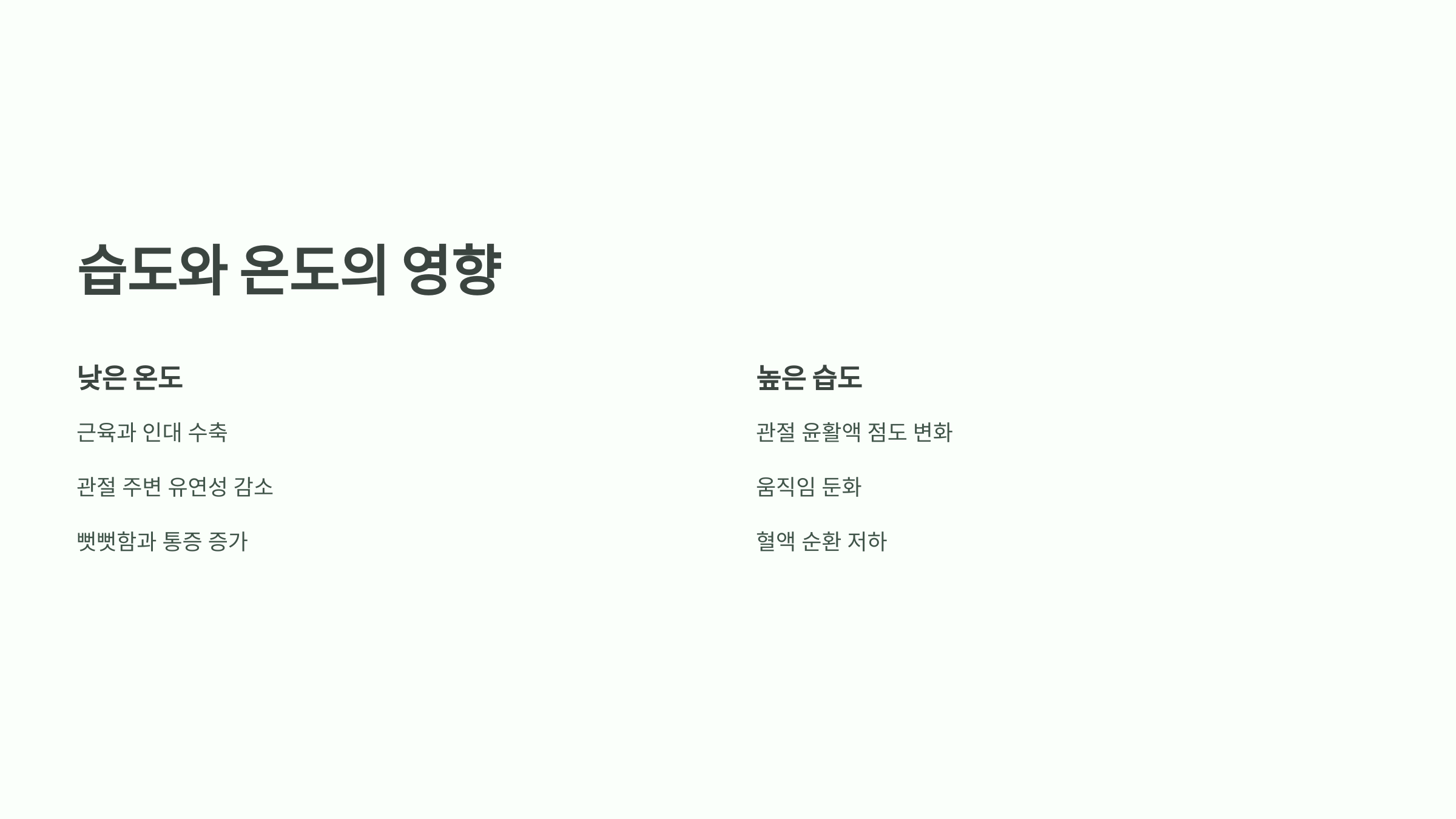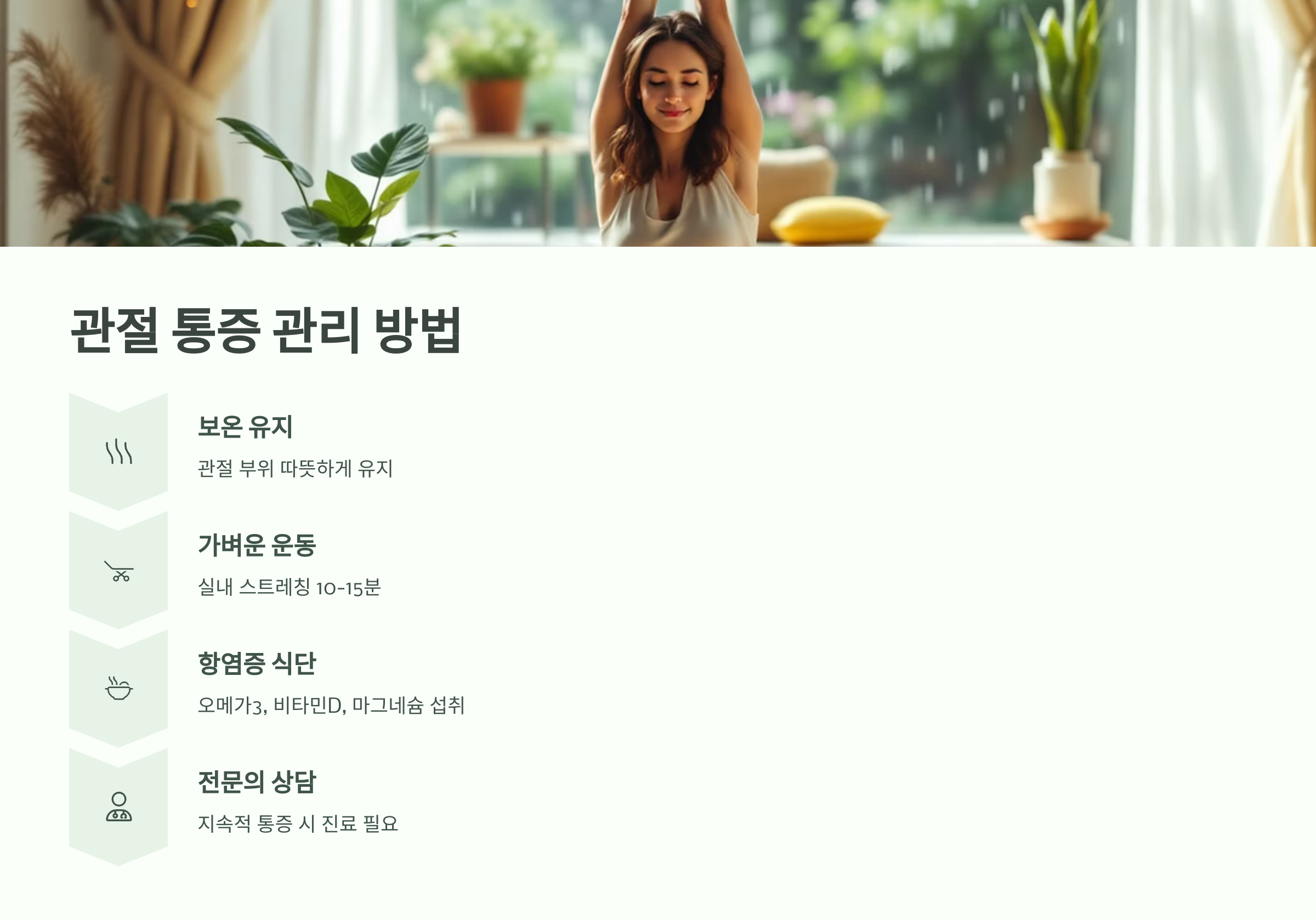 - 둘째, 가벼운 스트레칭과 관절 운동을 꾸준히 해주는 것이 좋습니다. 날씨가 흐리다고 활동을 줄이면 관절이 더욱 굳고 통증이 심해질 수 있으므로, 실내에서 할 수 있는 스트레칭을 하루 10~15분씩 실천해 보세요.