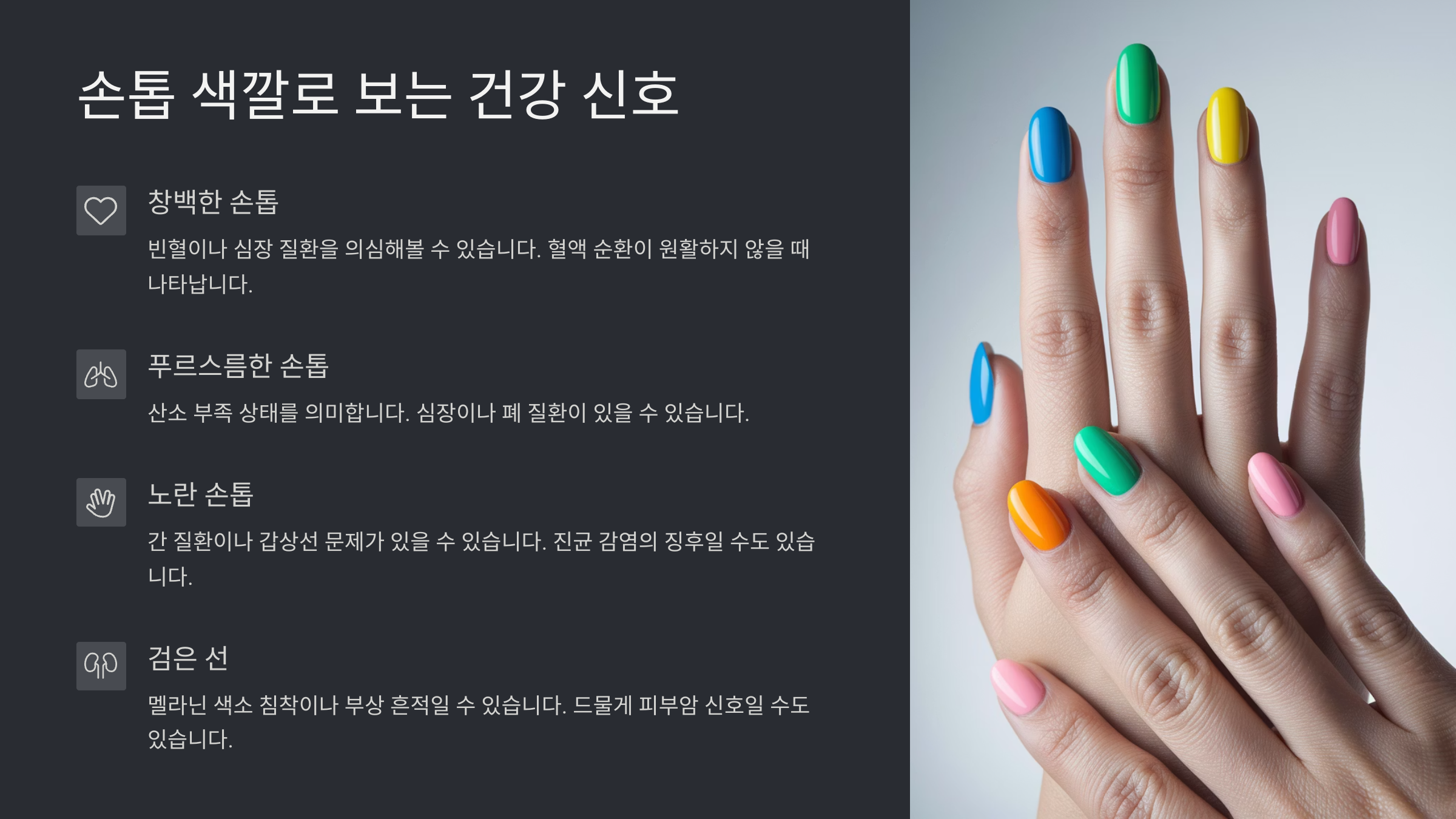이처럼 손톱 색은 우리 몸이 보내는 작지만 중요한 경고입니다. 손톱은 매니큐어나 젤로 가리는 것이 아닌, 정기적으로 확인하고 자연 상태로 관찰하는 습관이 중요합니다. 만약 색 변화가 갑자기 생기거나 지속된다면, 단순한 미용 문제가 아니라 건강 문제일 수 있으므로 반드시 전문가의 진단을 받아보는 것이 좋습니다.