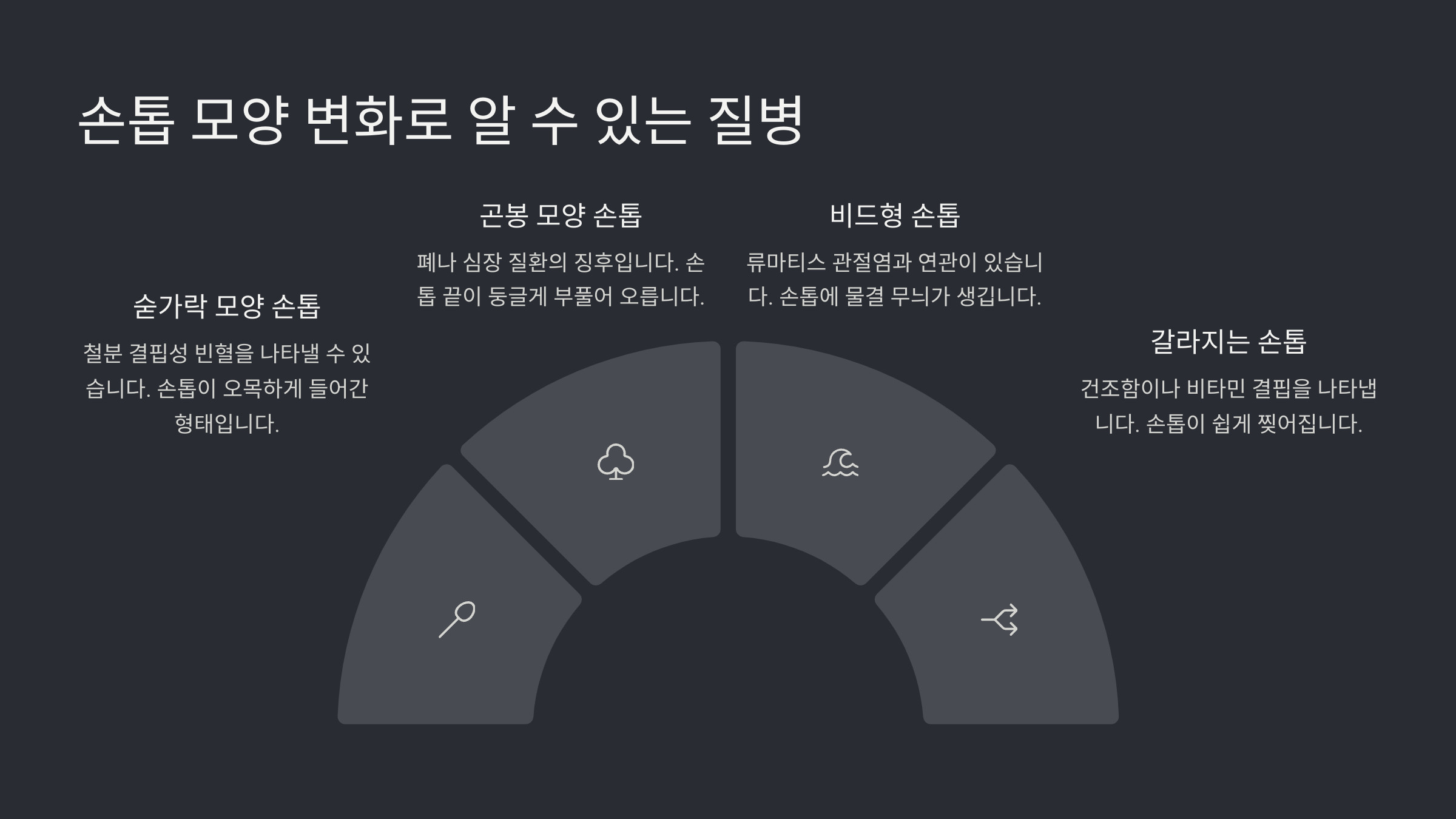 손톱은 말하지 않아도 몸이 보내는 신호를 담고 있습니다. 색이 변하거나 줄이 생기고 모양이 바뀌는 등의 변화는 단순한 미용상의 문제가 아니라 **우리 몸속 건강 이상을 알려주는 중요한 단서**일 수 있습니다. 작은 변화라도 눈여겨보고, 필요할 땐 전문가의 진단을 받는 것이 건강을 지키는 지름길입니다. 오늘 바로 손톱을 들여다보며 내 몸의 상태를 확인해보세요.