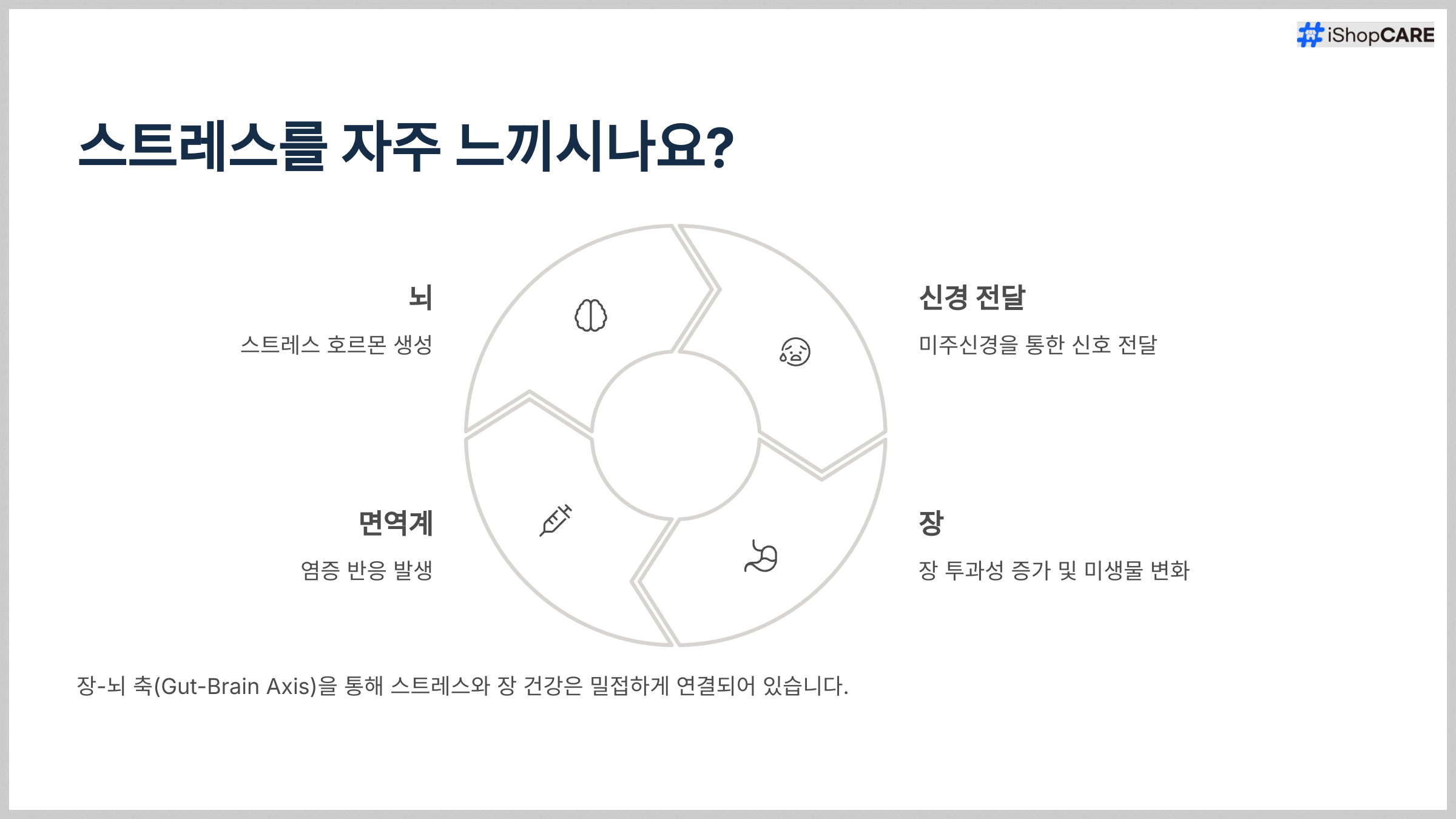 장은 ‘제2의 뇌’라 불릴 만큼 스트레스에 민감한 기관입니다. 스트레스를 받으면 장이 경련을 일으키거나 복통, 설사 등의 증상을 유발할 수 있습니다. 이는 장-뇌 축(Gut-Brain Axis)이라는 연결 메커니즘 때문인데요, 정신적인 스트레스가 곧바로 장 건강에 영향을 미칩니다. 장 트러블이 잦다면 스트레스 해소 방법도 함께 고려해보세요.