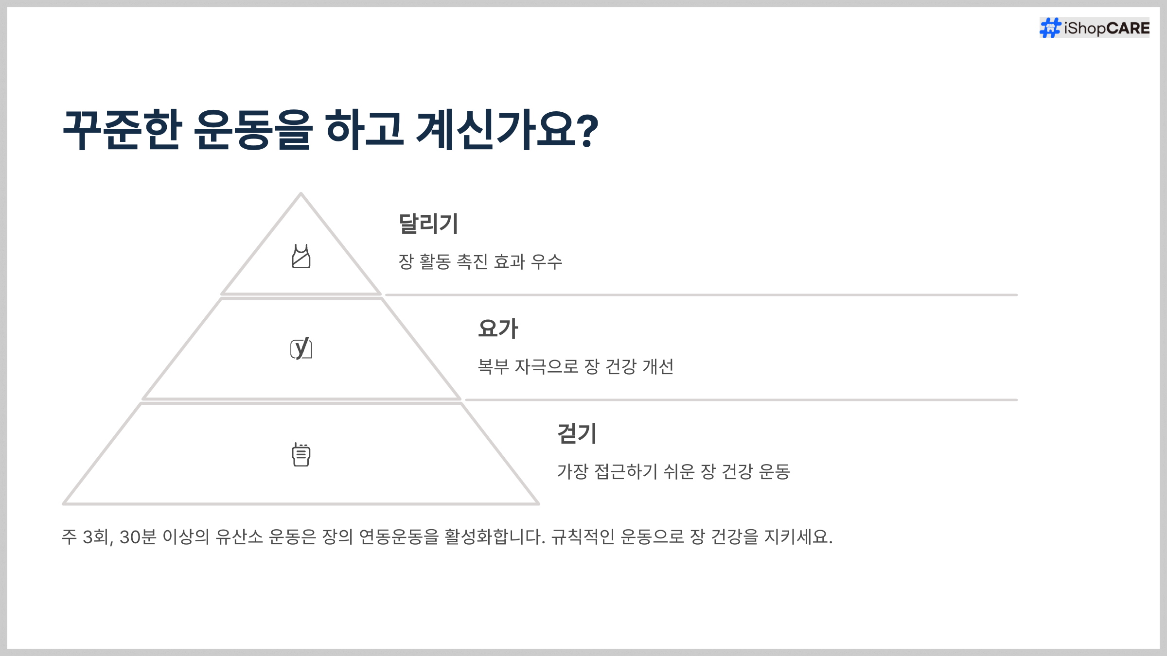 운동은 장의 연동운동을 활성화시켜 배변을 돕고, 장내 가스 배출에도 도움을 줍니다. 가벼운 걷기, 요가, 스트레칭과 같은 운동을 하루 30분 이상 실천하면 장 기능이 향상되고 장내 유익균의 활동도 활발해집니다. 특히 장 트러블을 자주 겪는 사람이라면 무리한 운동보다는 가벼운 운동을 꾸준히 하는 것이 더욱 효과적입니다.