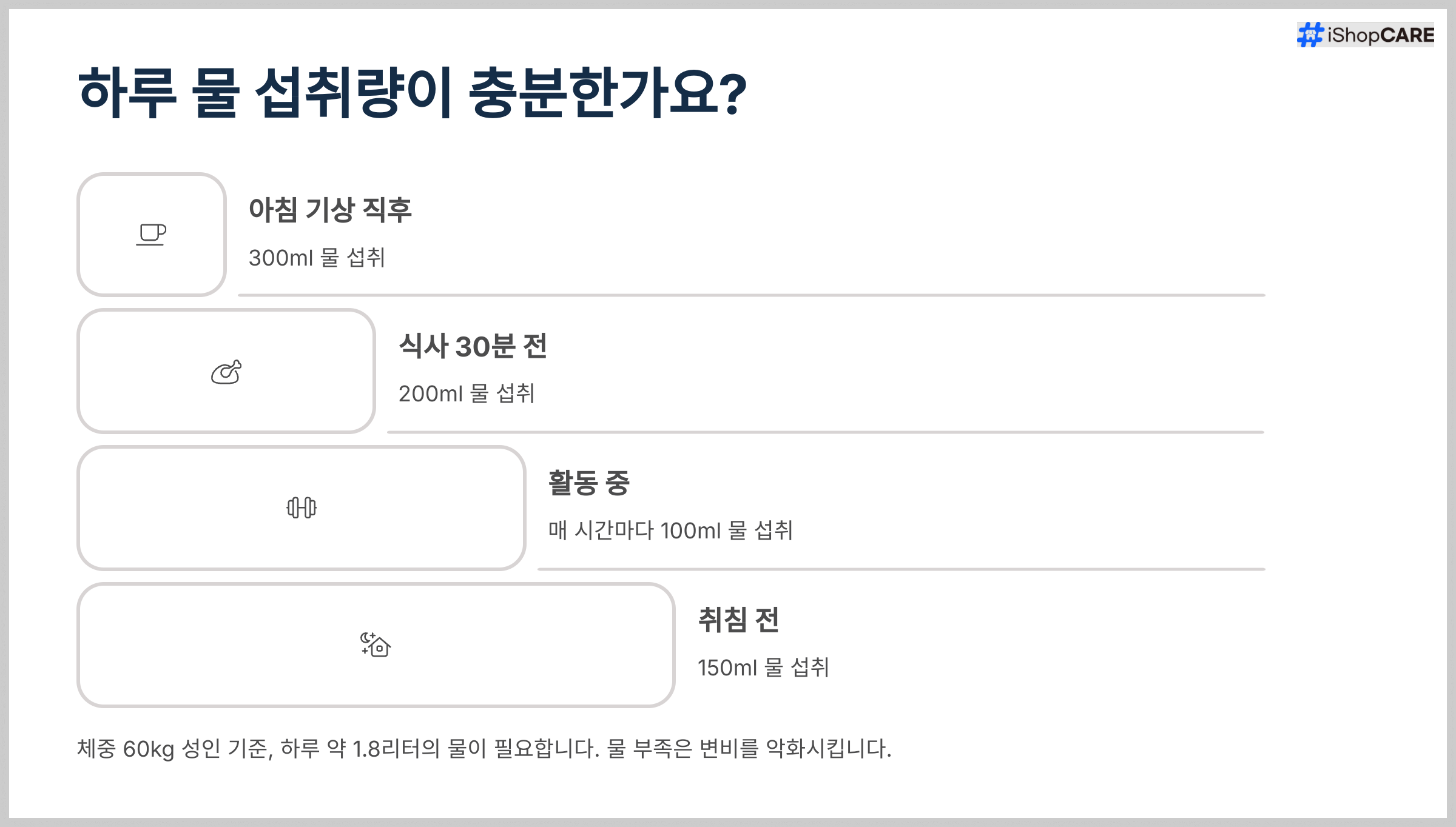 수분은 장내 내용물을 부드럽게 만들어 배변을 원활하게 돕습니다. 물이 부족하면 변이 딱딱해지고 장 운동도 둔해져 변비로 이어지기 쉽습니다. 하루 1.5~2리터 정도의 수분 섭취가 권장되며, 특히 아침 공복에 따뜻한 물을 마시면 장을 자극하는 데 효과적입니다. 카페인 음료보다는 생수나 보리차 등 무카페인 음료가 장 건강에는 더 좋습니다.