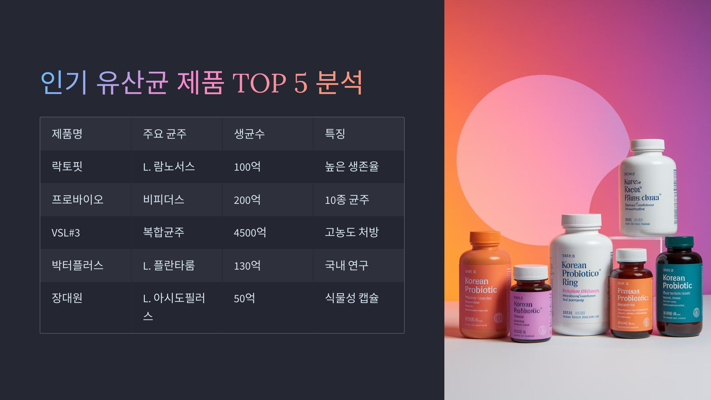 현대인의 장 건강을 지키기 위해 유산균 섭취는 필수적인 선택이 되었습니다. 다양한 유산균 제품이 출시되고 있지만, 어떤 제품이 진짜 효과적인지 헷갈리는 경우가 많습니다. 이 글에서는 장 건강에 효과적인 주요 유산균 제품들을 비교 분석하여 소비자들이 현명한 선택을 할 수 있도록 도와드립니다.