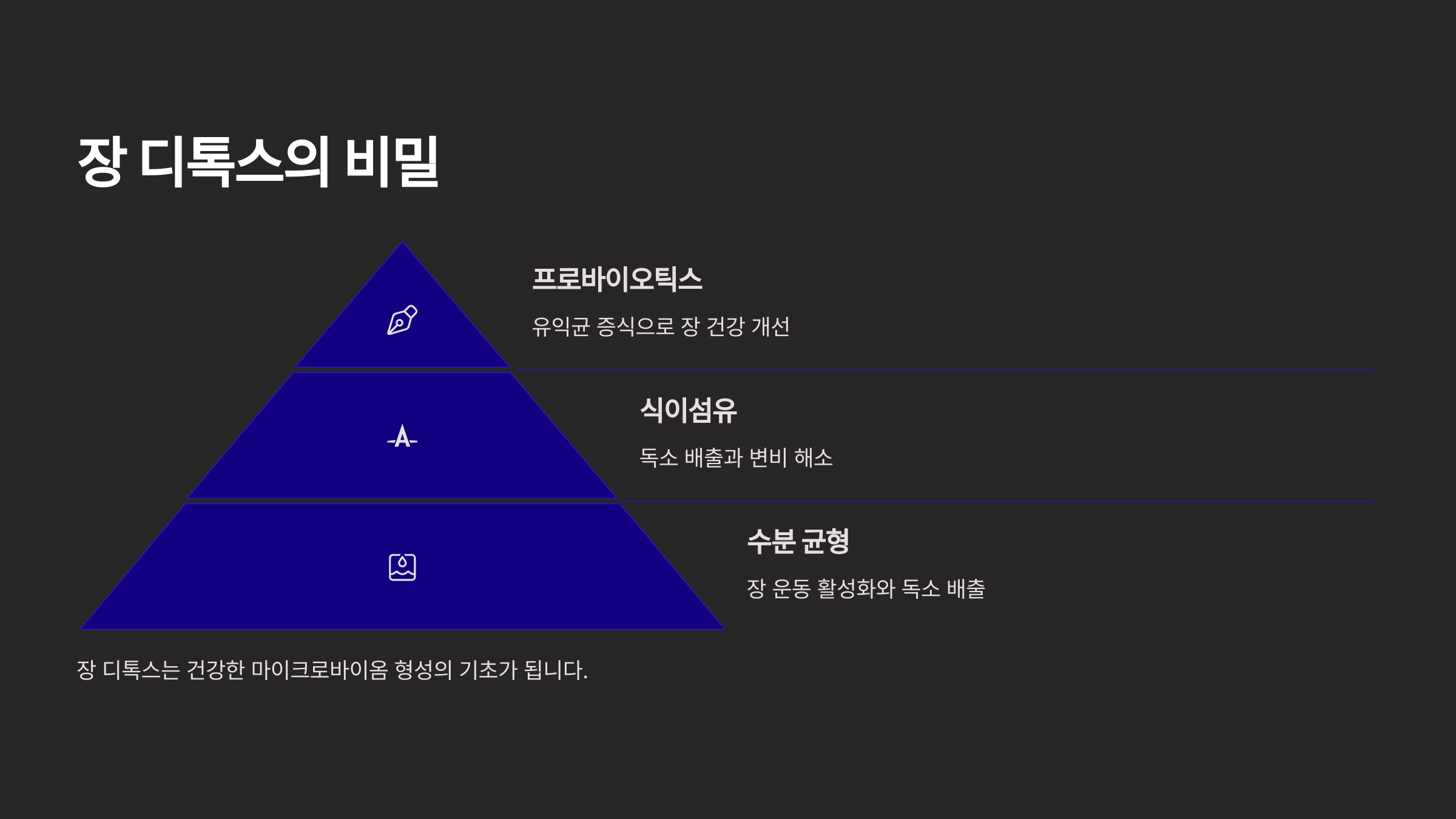 디톡스는 단기간의 요법이 아니라 건강한 식단과 생활 습관을 꾸준히 유지하는 것이 핵심입니다. 간과 장은 이미 해독 기능을 가지고 있으며, 우리 몸은 스스로를 회복할 수 있는 힘이 있습니다. 과도한 단식이나 무리한 해독은 오히려 건강을 해칠 수 있습니다.