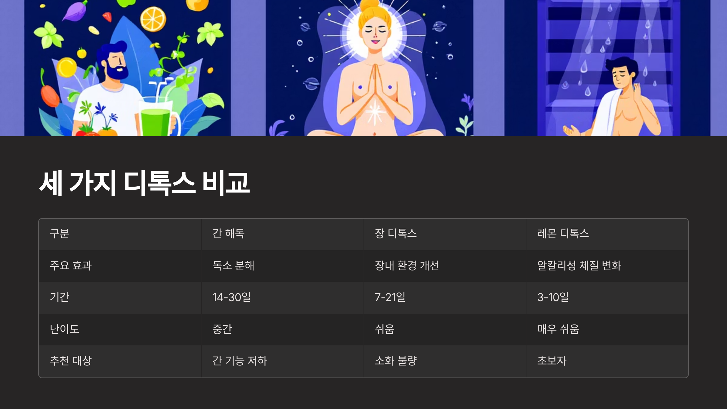 | 구분 | 간 해독 | 장 디톡스 | 레몬 디톡스 |